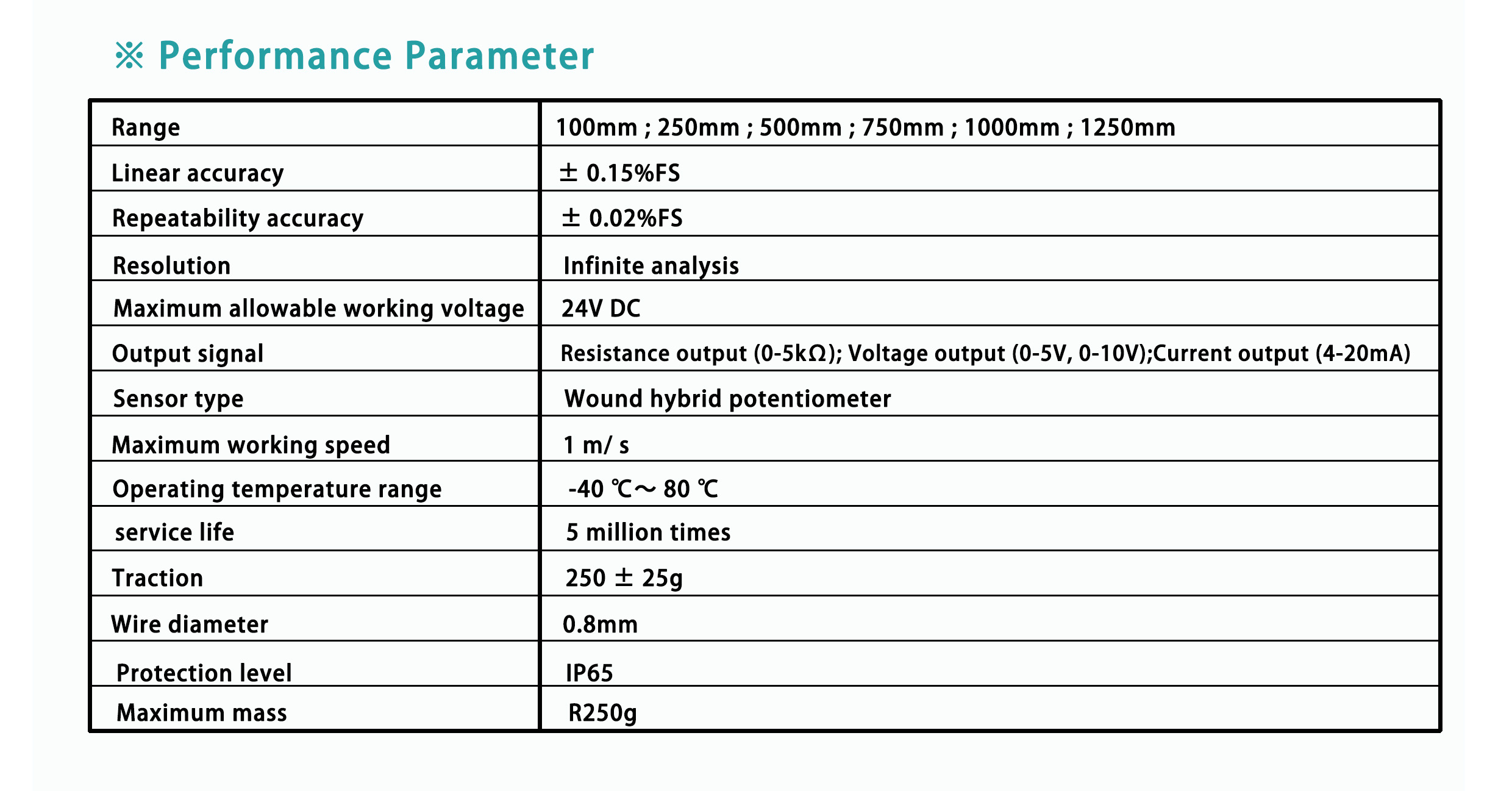Output signal: resistance output(0-5KΩ); Voltage signal (0-5V, 0-10V); Current signal (4-20mA)