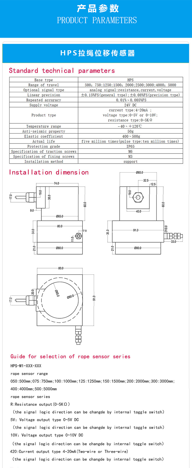 HPS拉繩位移傳感器,傳感器精度高,穩(wěn)定性好,適用于各類自動化設備位移測量與位置定位。